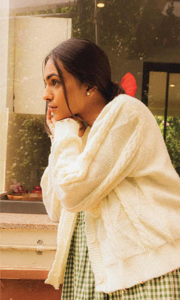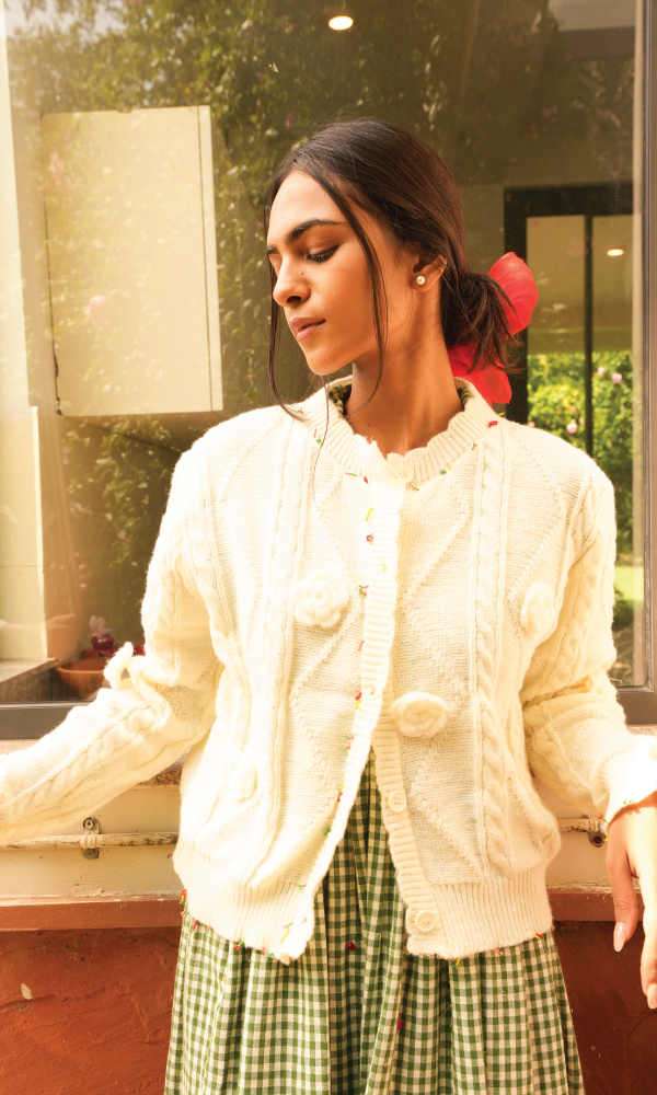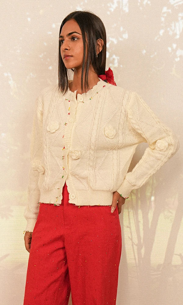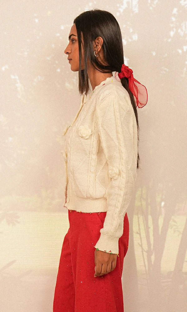 A classic flat knit cable pattern sweater, elevated with hand-crocheted floral accents. Featuring delicate bead embroidery along the neckline and sleeve edges, this piece offers a blend of timeless design and subtle detailing. Perfect for adding a touch of elegance to everyday wear.