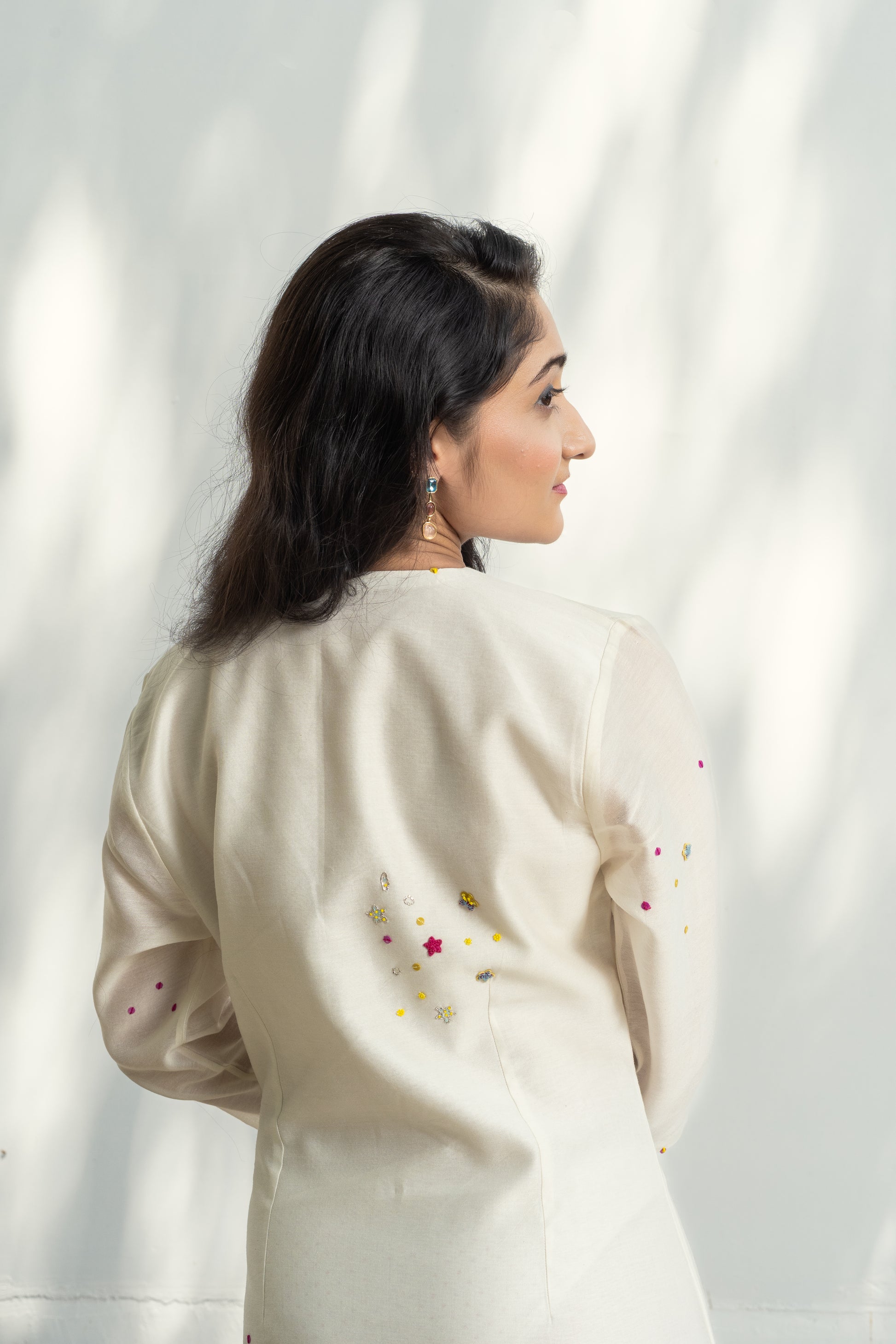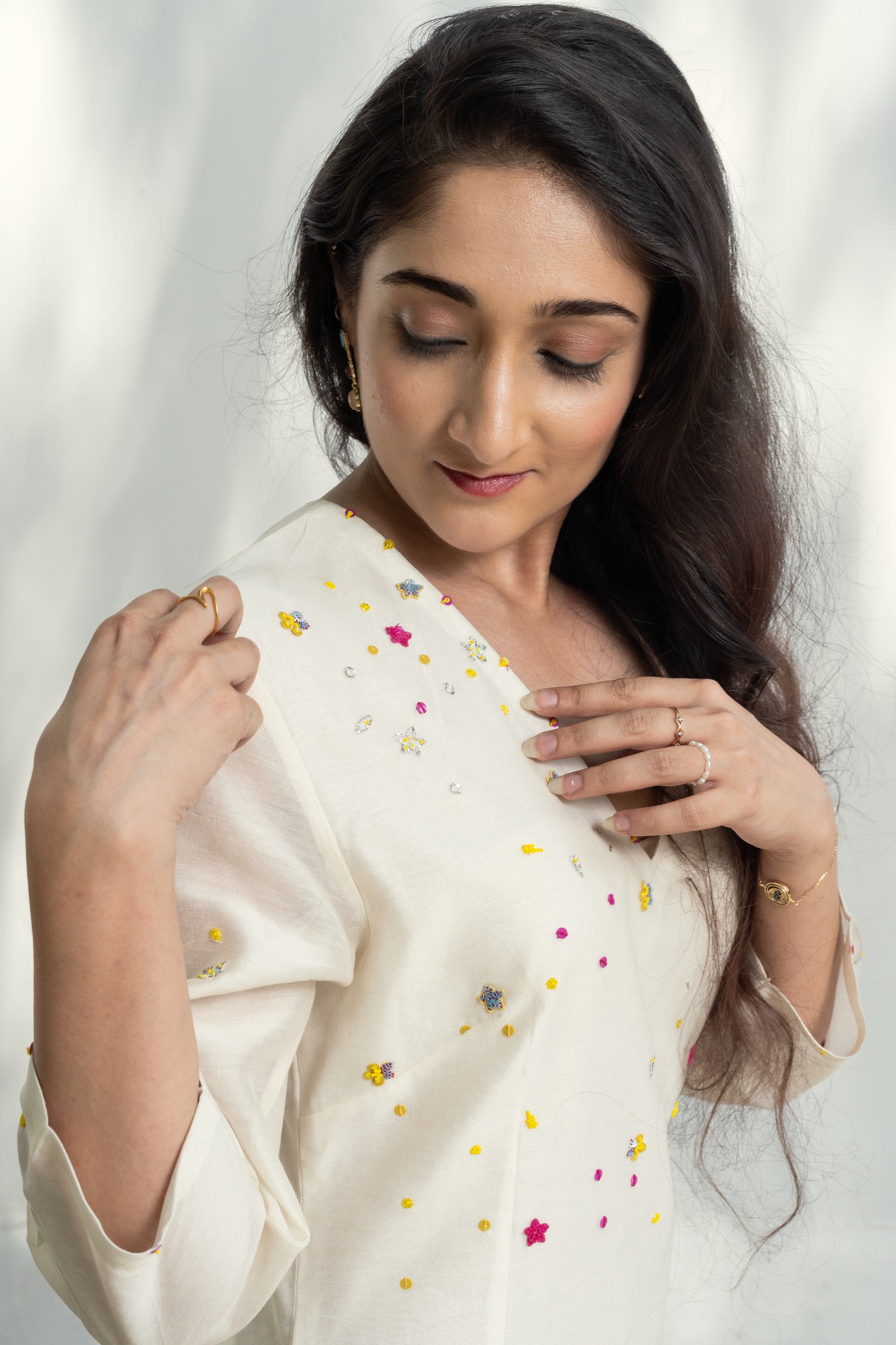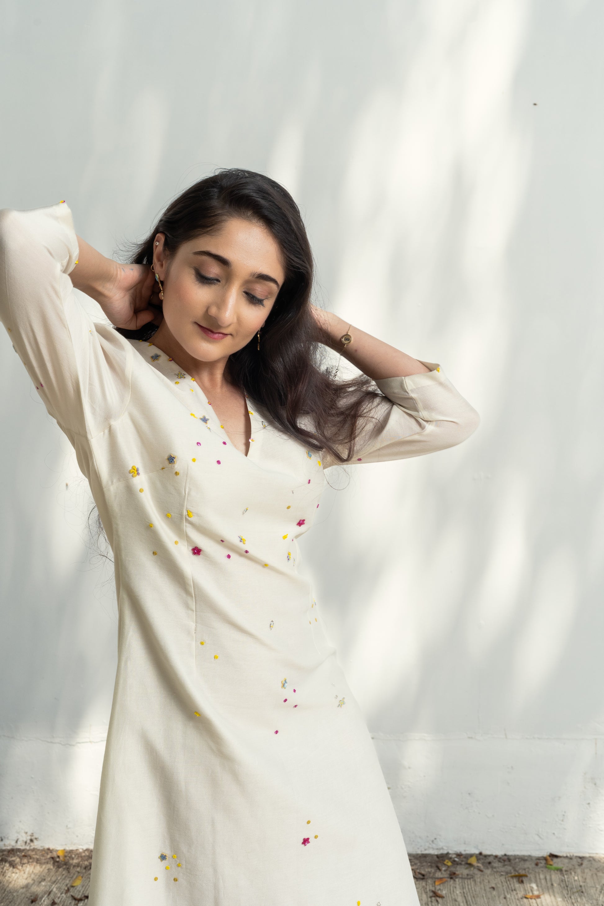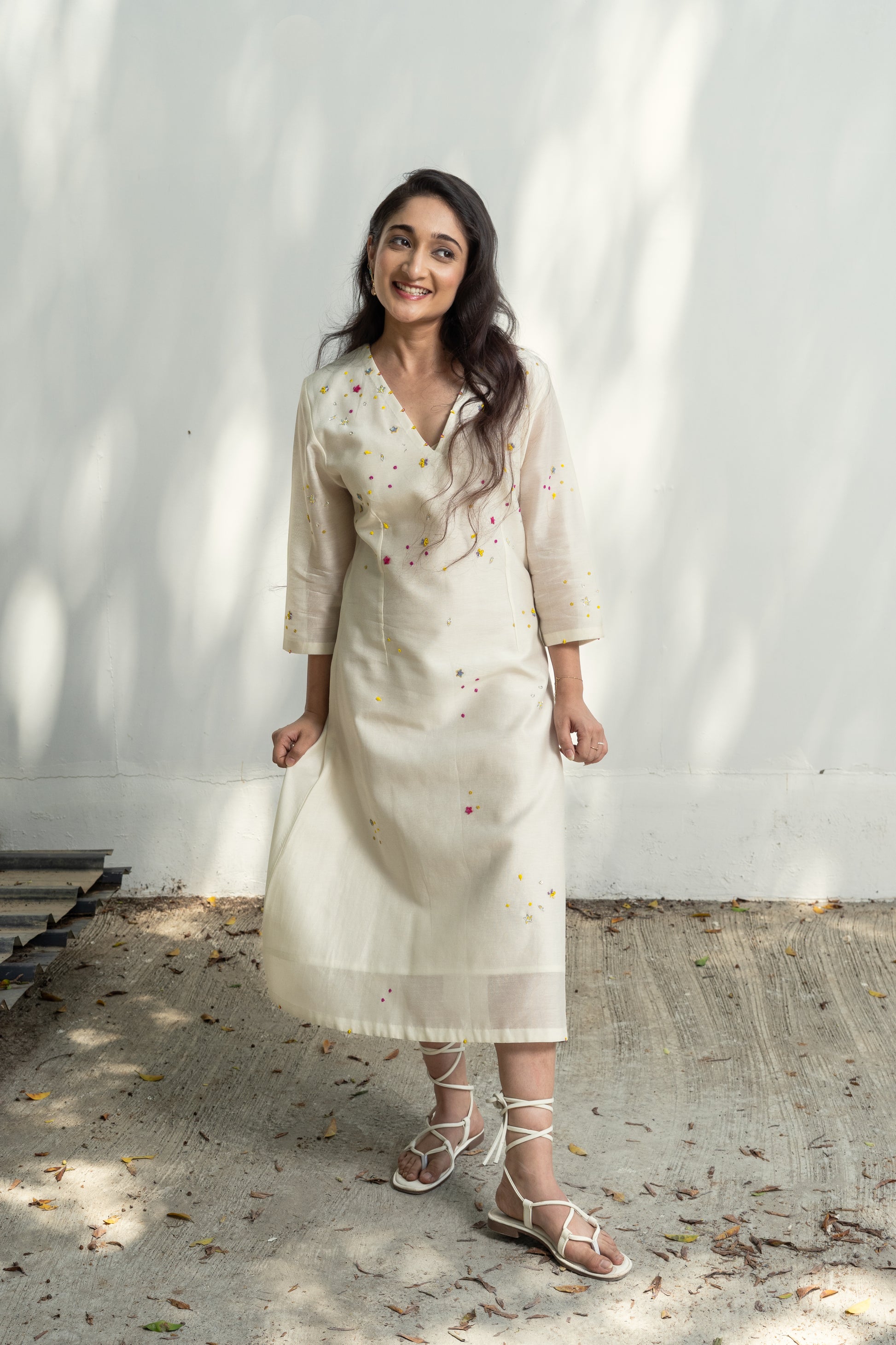 Ann's Almost Dress is an A-line, V-neckline dress with relaxed three-fourth sleeves and an ankle-grazing midi length. Crafted in cotton chanderi and lined with soft cotton, it’s delicately embroidered with 3D stars, dabka stars, sequins, and beads scattered all over bringing a quiet elegance to every twirl.