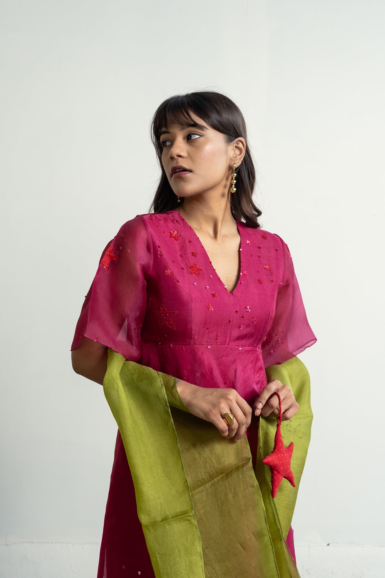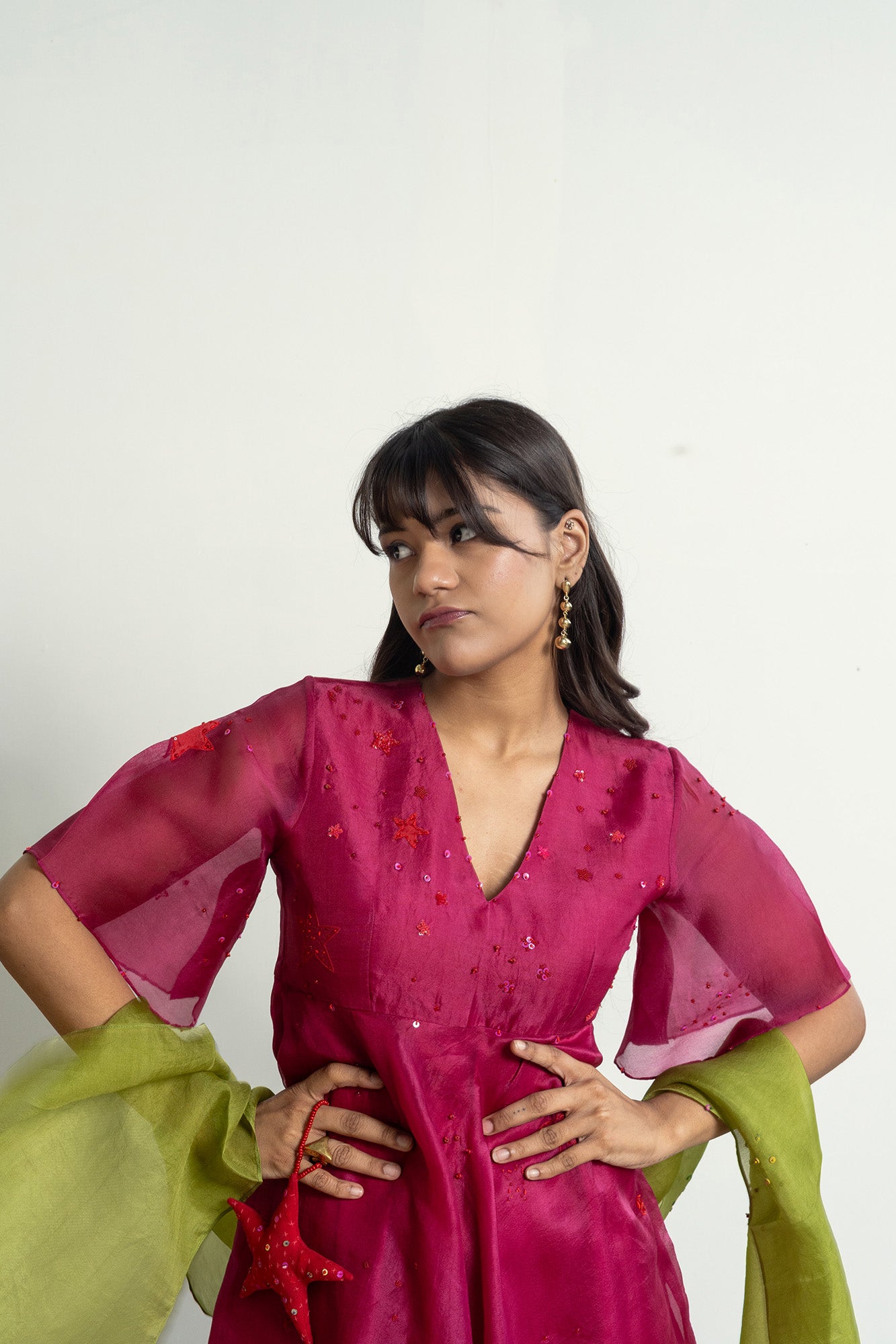 Ann’s Pink Dress is crafted from organza silk and adorned with abstract star embroidery using beads, sequins, and anchor threads. Scattered red patchwork stars add depth and contrast. The flared sleeves and bias-cut hemline create a flowing, dreamy silhouette.