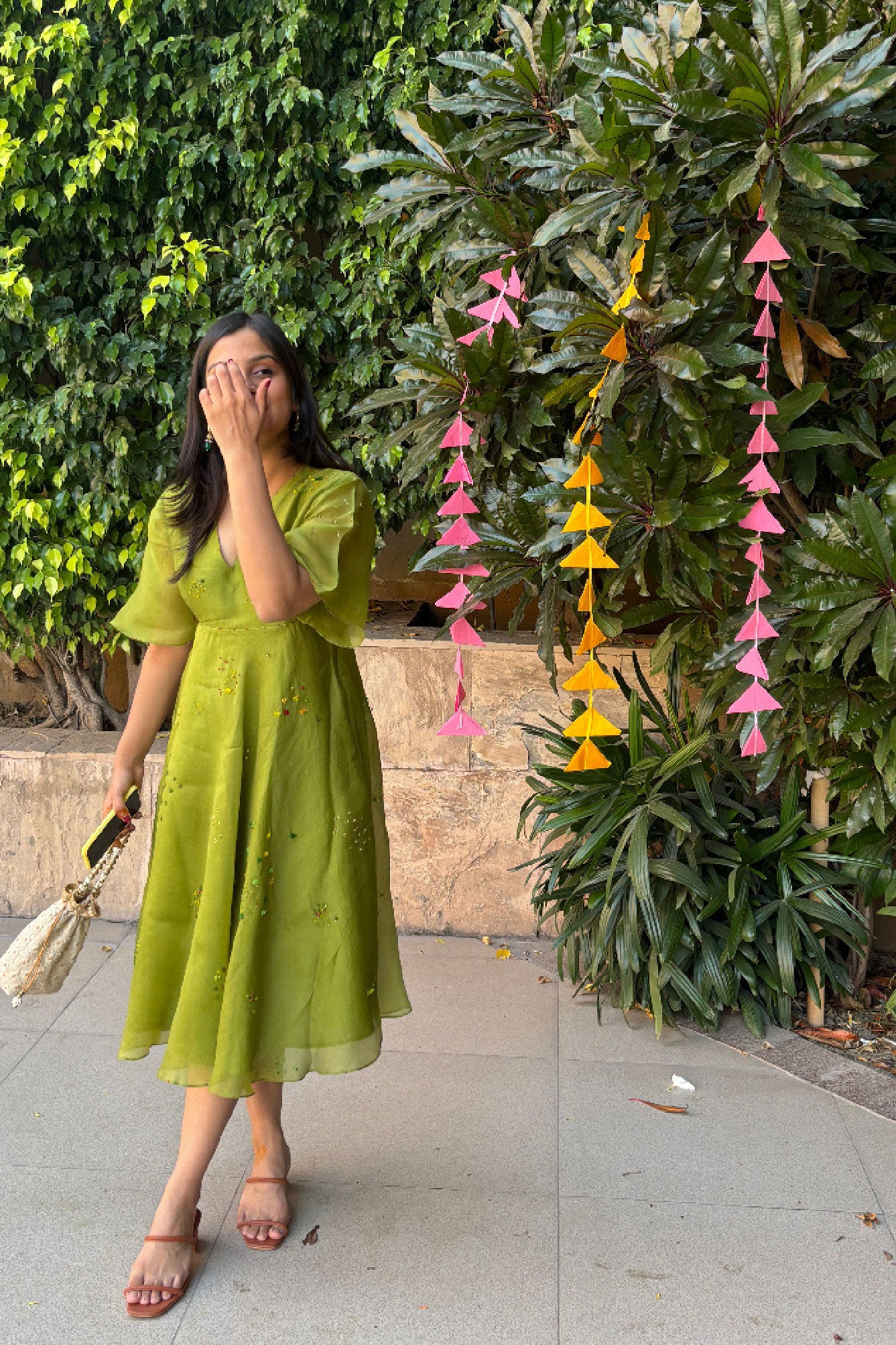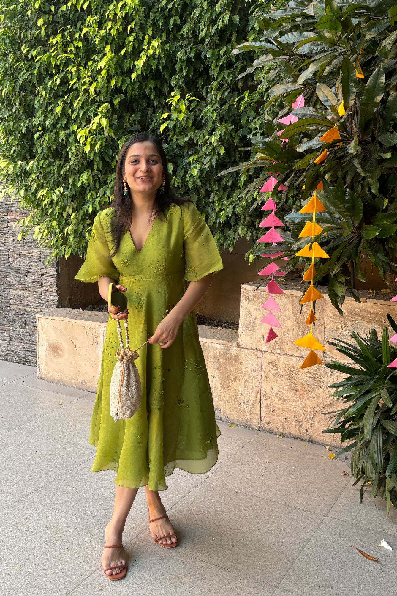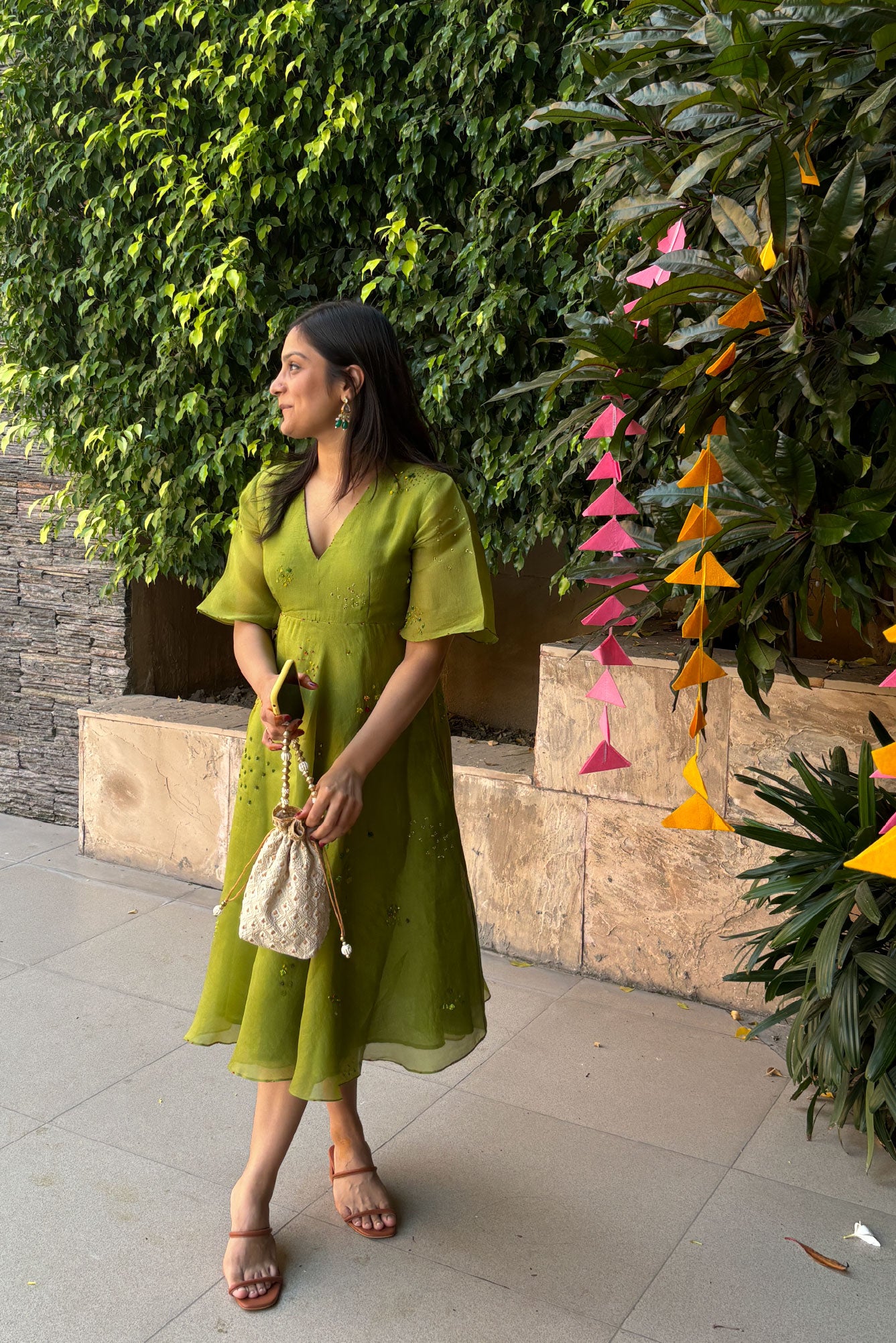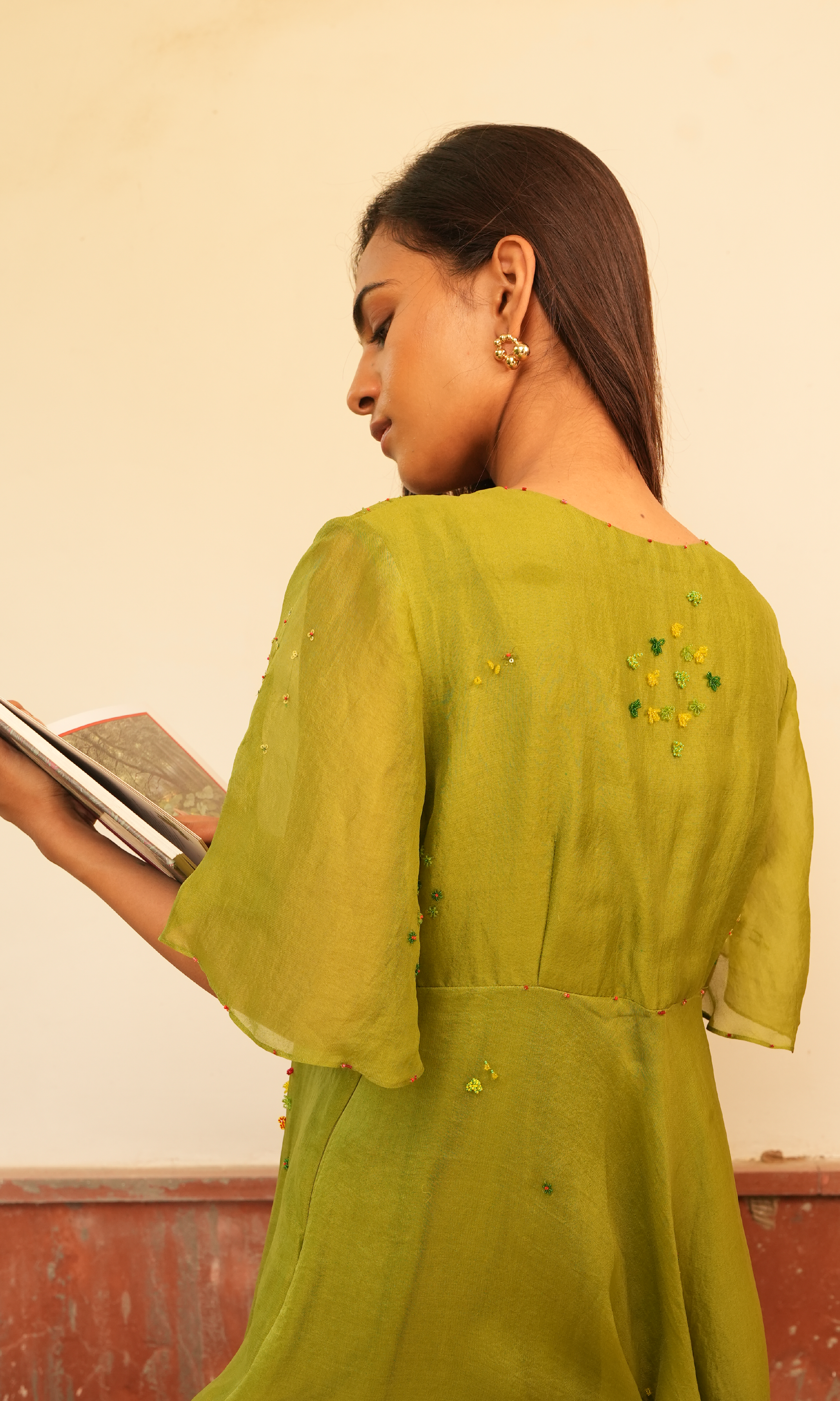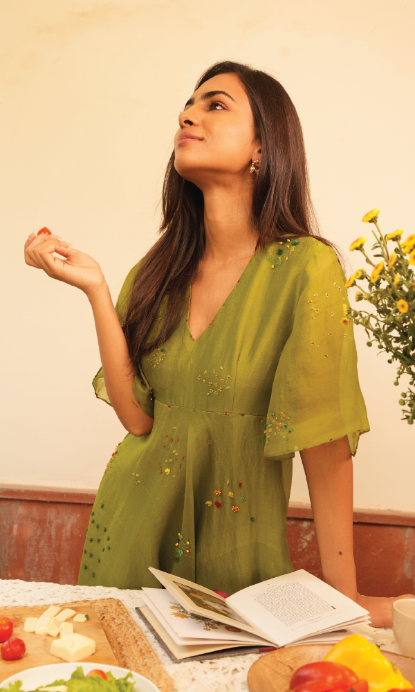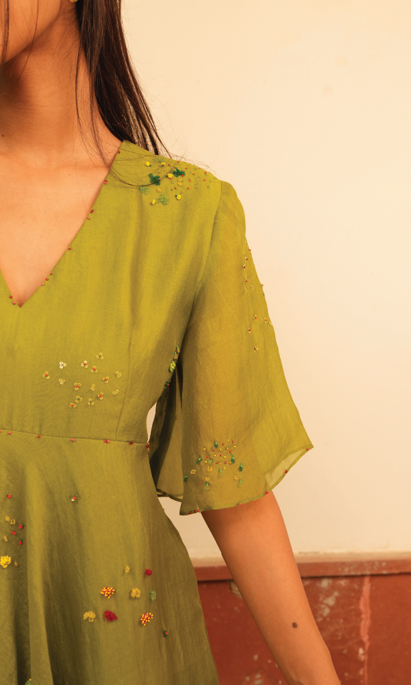 Ann's Bouquet Dress is crafted from organza silk, featuring abstract floral embroidery in green, yellow, and red. The design includes elegant flare sleeves and a baised ghera, creating a fluid, graceful silhouette. Perfect for understated elegance with a touch of vibrant detail.