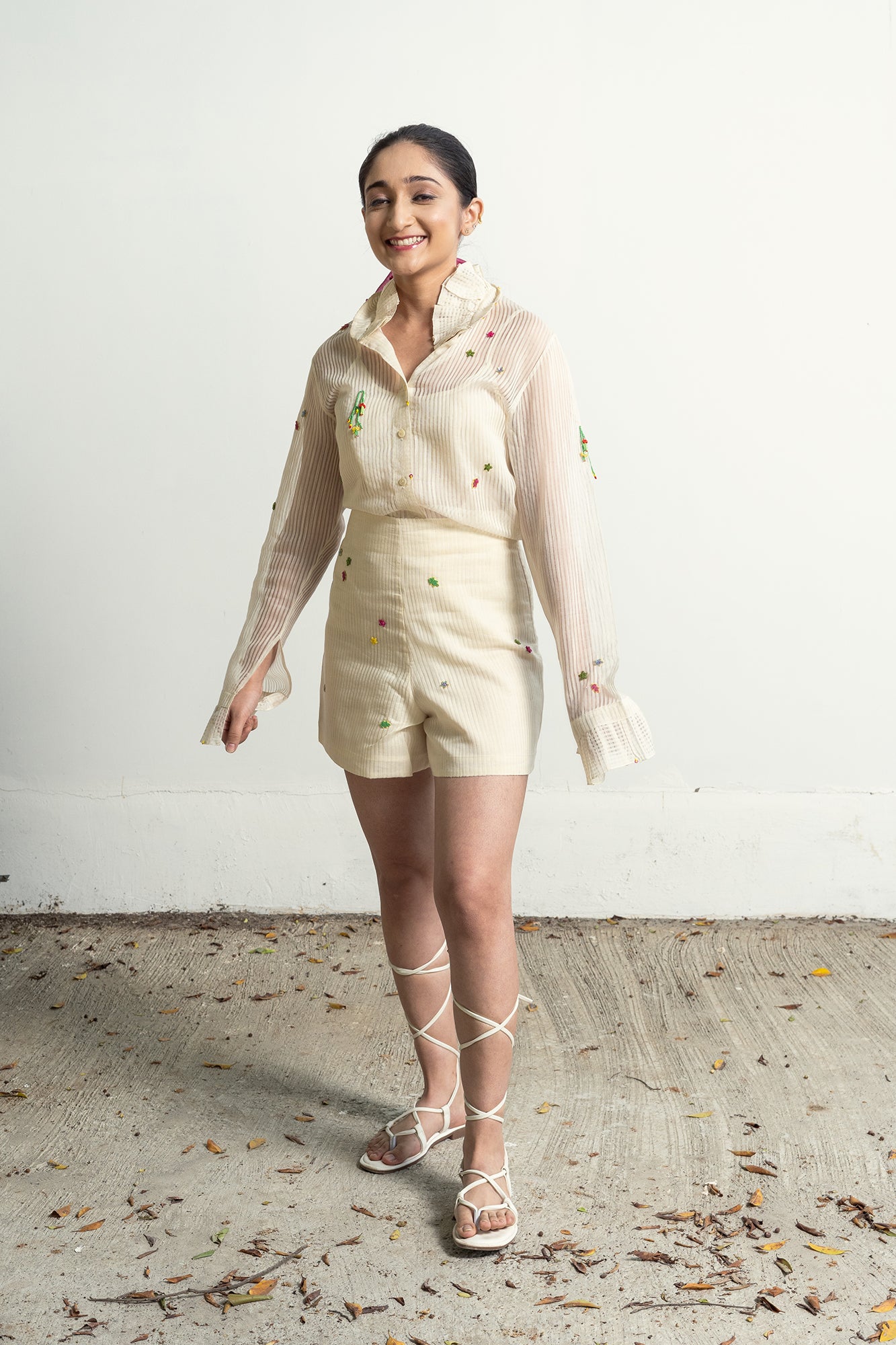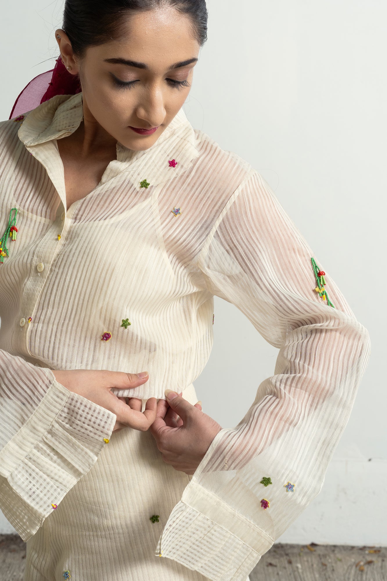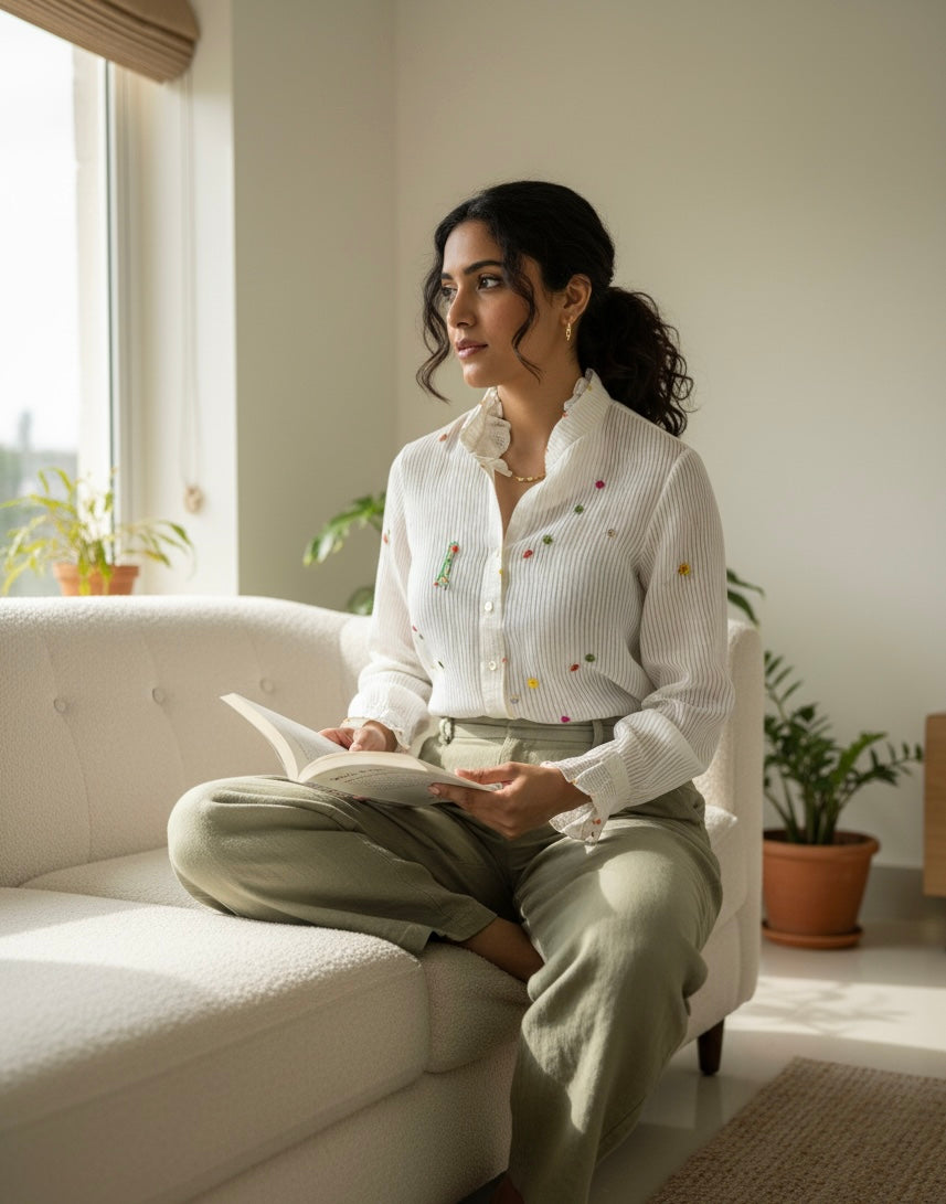 Ann’s Striped White Shirt is made from chanderi cotton in soft off-white, adorned with embroidered stars throughout. Latkan details add a touch of playfulness, while gathered sleeve ends enhance the structure. The shirt comes with a soft cotton slip.