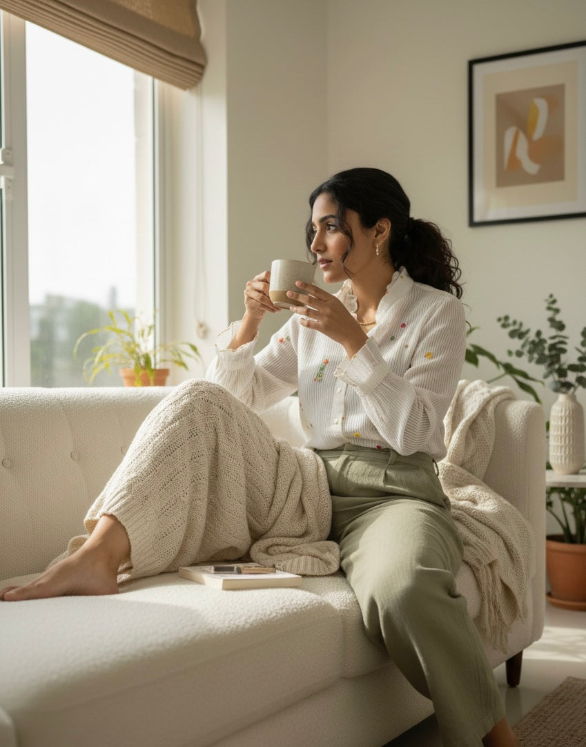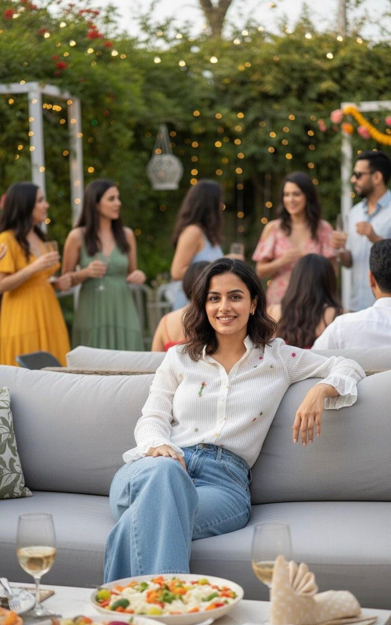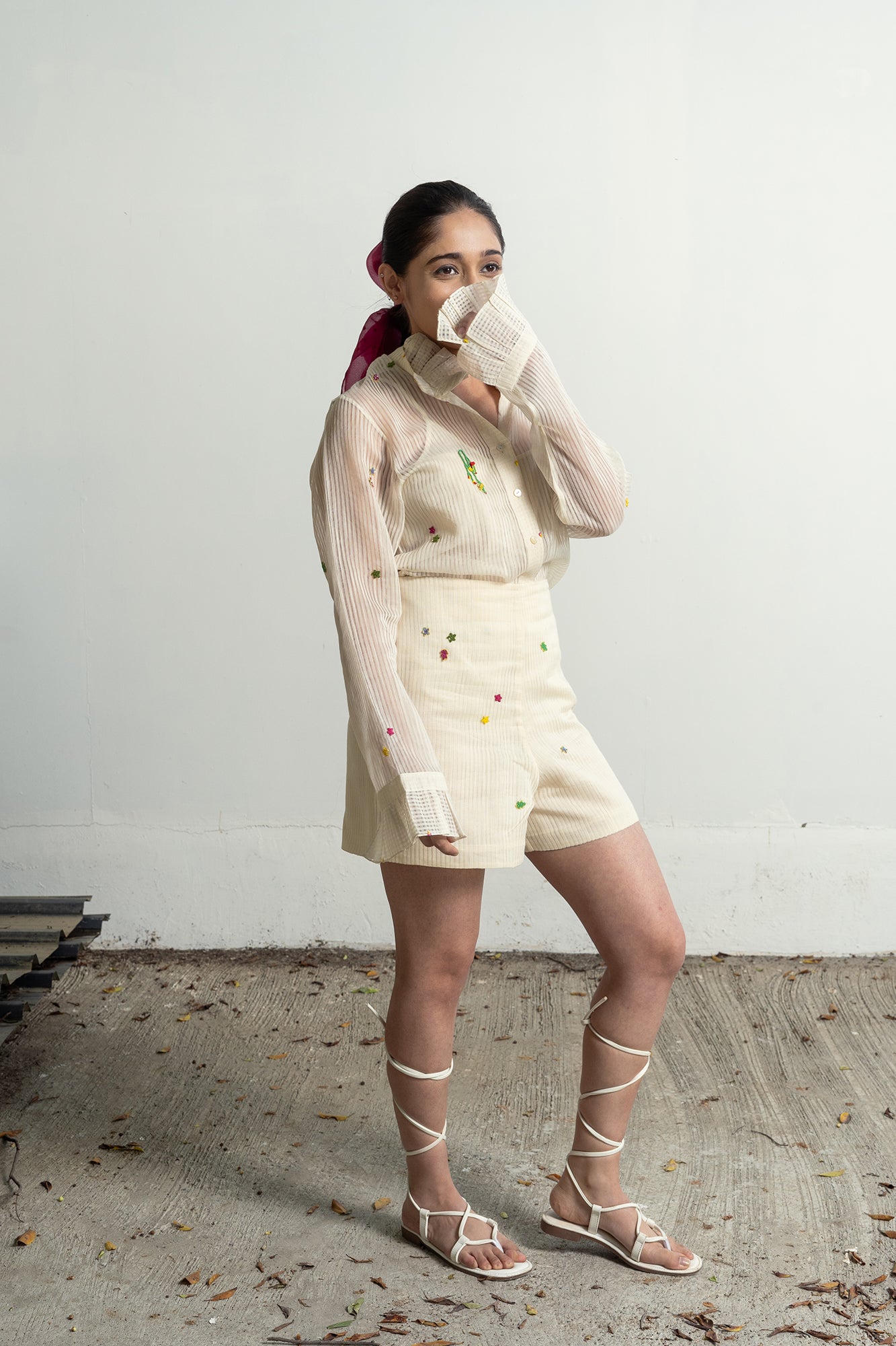 Ann’s Striped White Shirt is made from chanderi cotton in soft off-white, adorned with embroidered stars throughout. Latkan details add a touch of playfulness, while gathered sleeve ends enhance the structure. The shirt comes with a soft cotton slip.