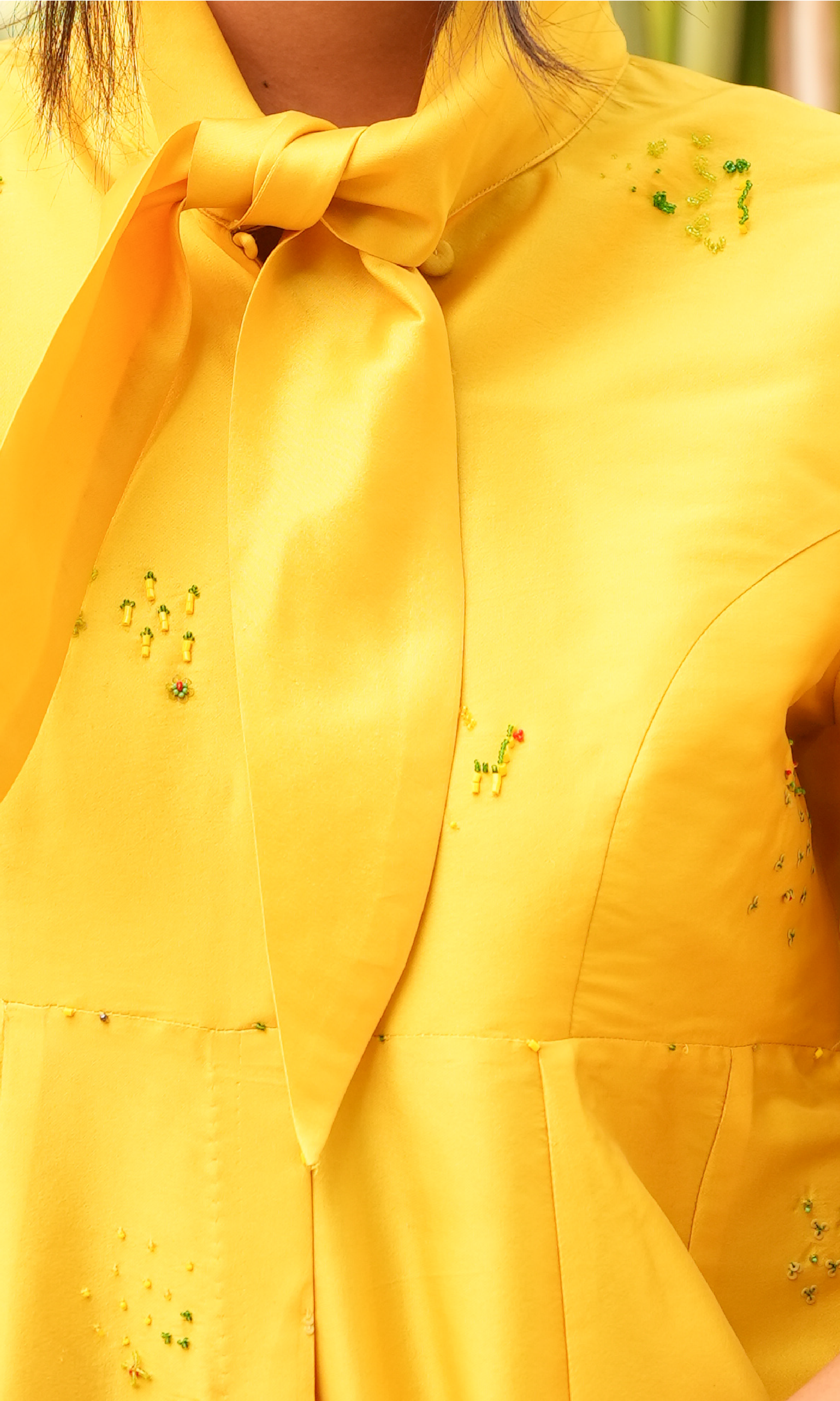 Ann's Wednesday Dress is crafted from silk taffeta fabric, adorned with delicate and abstract green-yellow embroidery. It features an elegant kali and a modern silhouette, with a tie-up detail at the neck that makes it a must-have in every wardrobe
